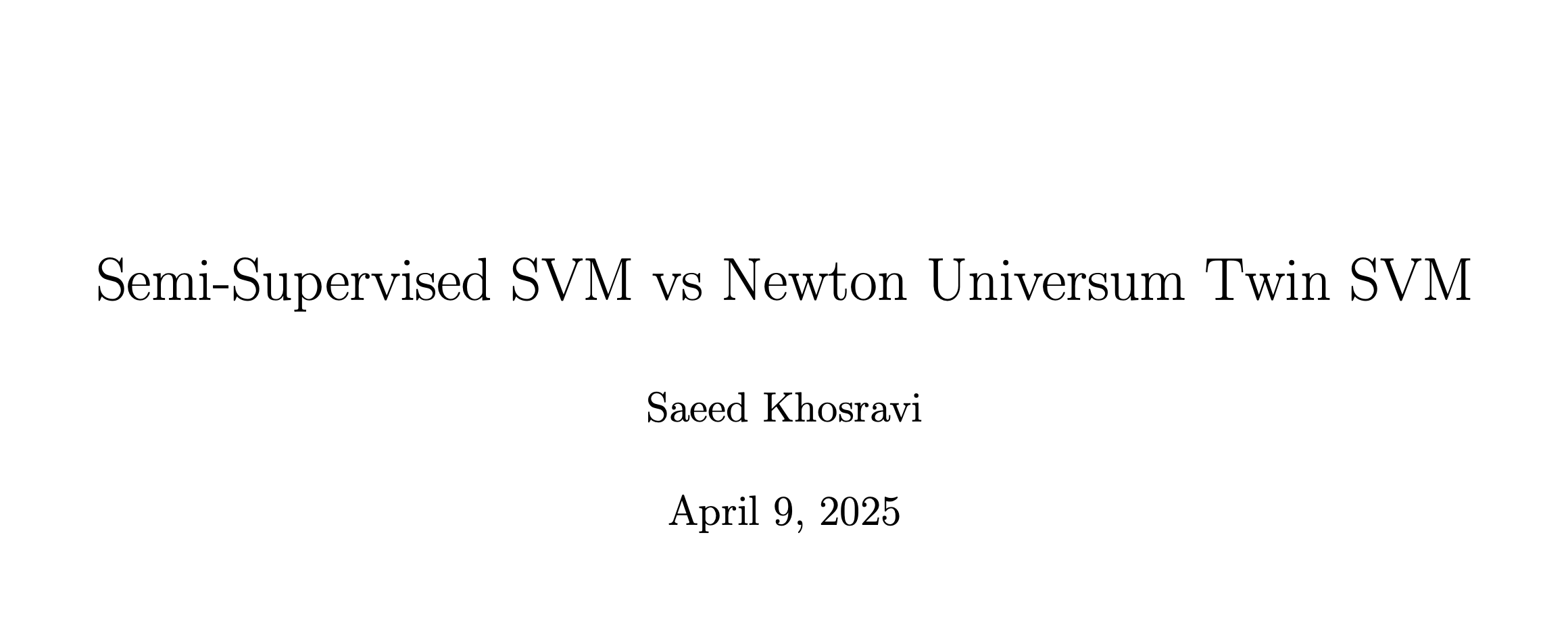 In this project, we implemented two models: the Semi-Supervised SVM (S3VM) and the Newton-based Universum Twin SVM (Newton-UTSVM). S3VM strengthens learning with unlabeled data, while Newton-UTSVM improves generalization using Universum data. After comparing their performance, we propose a new method—the Unconstrained S3VM—that combines the advantages of both approaches for a more flexible solution.